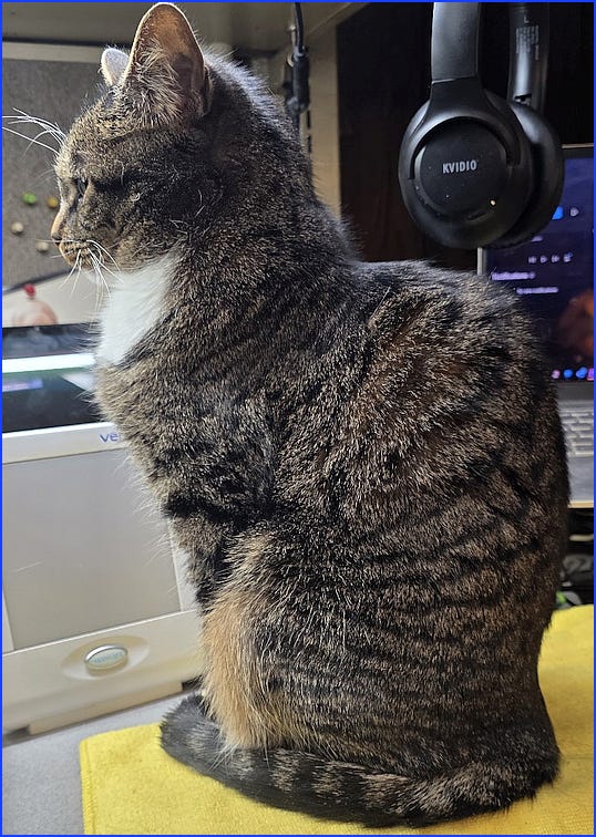Cleansing the palate: here’s a photo of my office kitty, Anna, listening as I read her the potential entries for today’s newsletter. What can I say? She’s a tough audience.